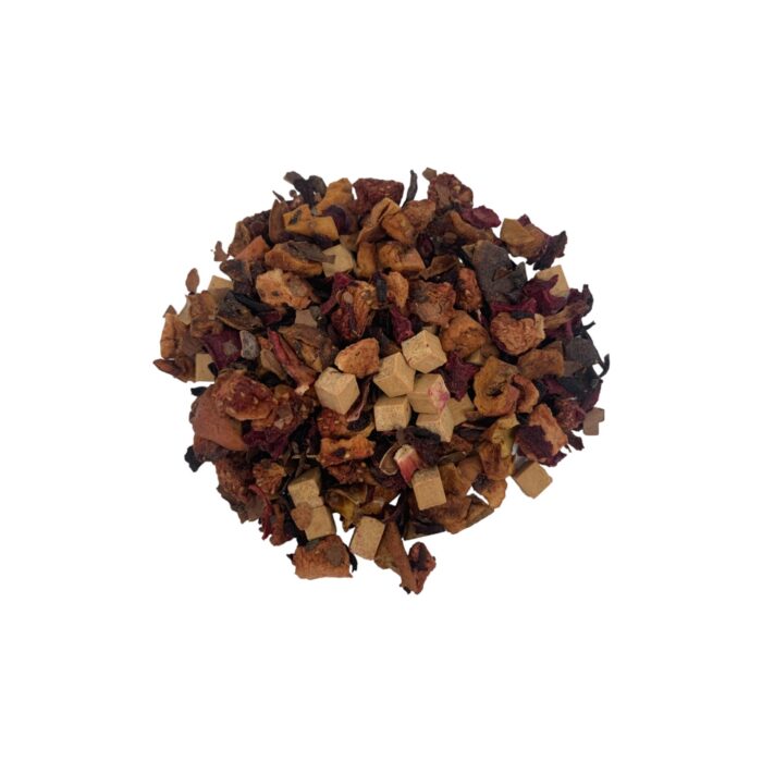 Dés de caramel, de cacao, de morceaux de pomme et de fraises.