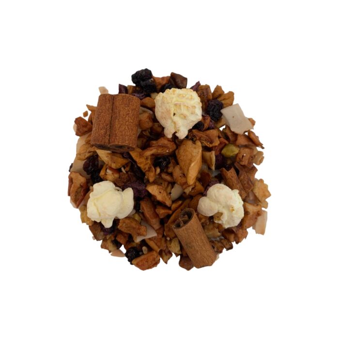 Morceaux de pomme, écorces de cannelle, morceaux d’ananas, morceaux de papaye, corinthes, amandes grillées, chips de coco, popcorn.