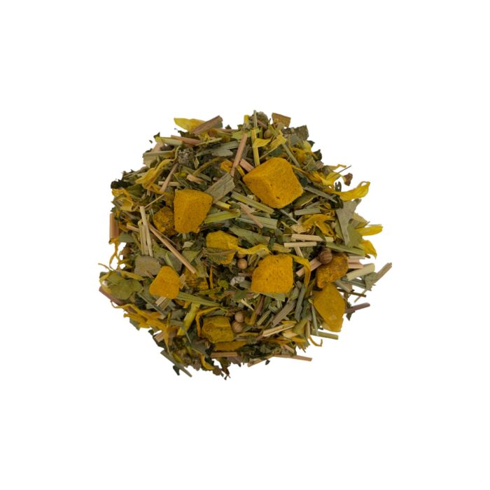 Infusion purifiante. Mélange savoureux et bienfaisant composé de curcuma, ananas, gingembre, citronnelle, coriandre, feuilles d’ortie, d’eucalyptus, de menthe et de framboise, écorces d’orange, fleurs de souci.