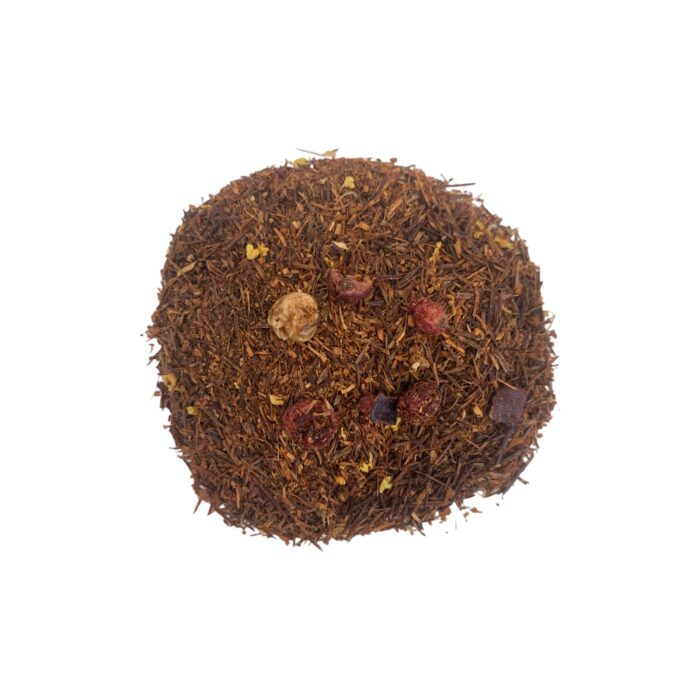 Rooibos doux et fruité : Fine alliance de prunes Reine-Claude (qui portent leur nom en hommage à l ‘épouse discrète et bienveillante de François Ier), de baies de groseille et de fleurs d’osmanthus.